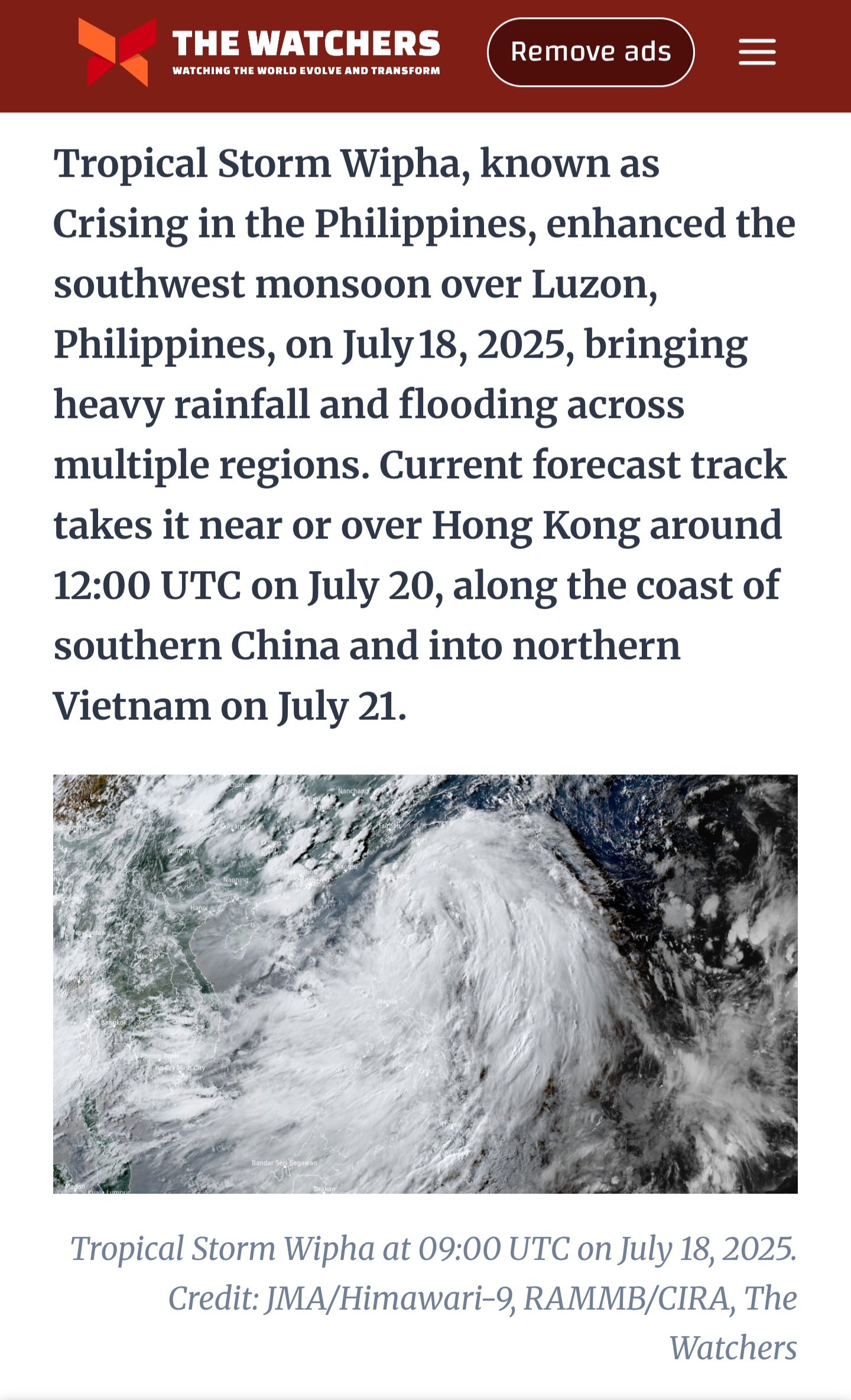 열대성 폭풍 위파는 7월 18일 북부 루손 섬에 심각한 위험을 초래하여 남서부 계절풍을 강화하고 마닐라 수도권, 중부 루손, 북부 루손 섬에 광범위한 비를 내렸습니다.