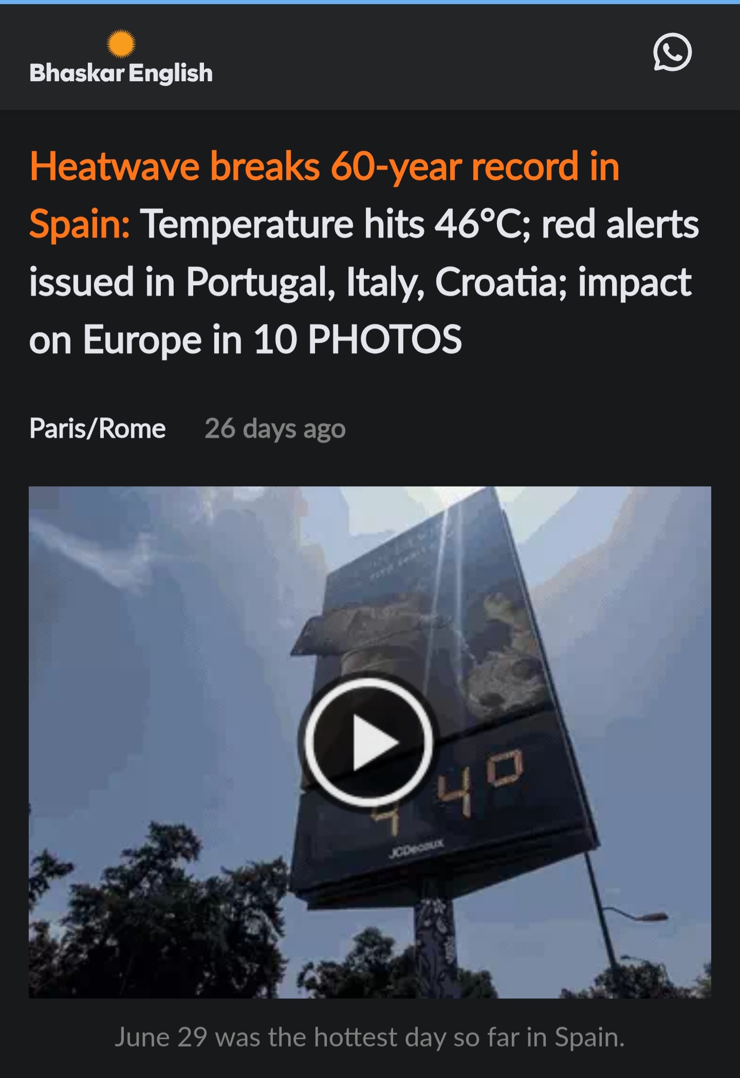 올해 6월 10일에 이탈리아에 첫 폭염이 닥쳤고 기온은 38°C에 달했습니다.